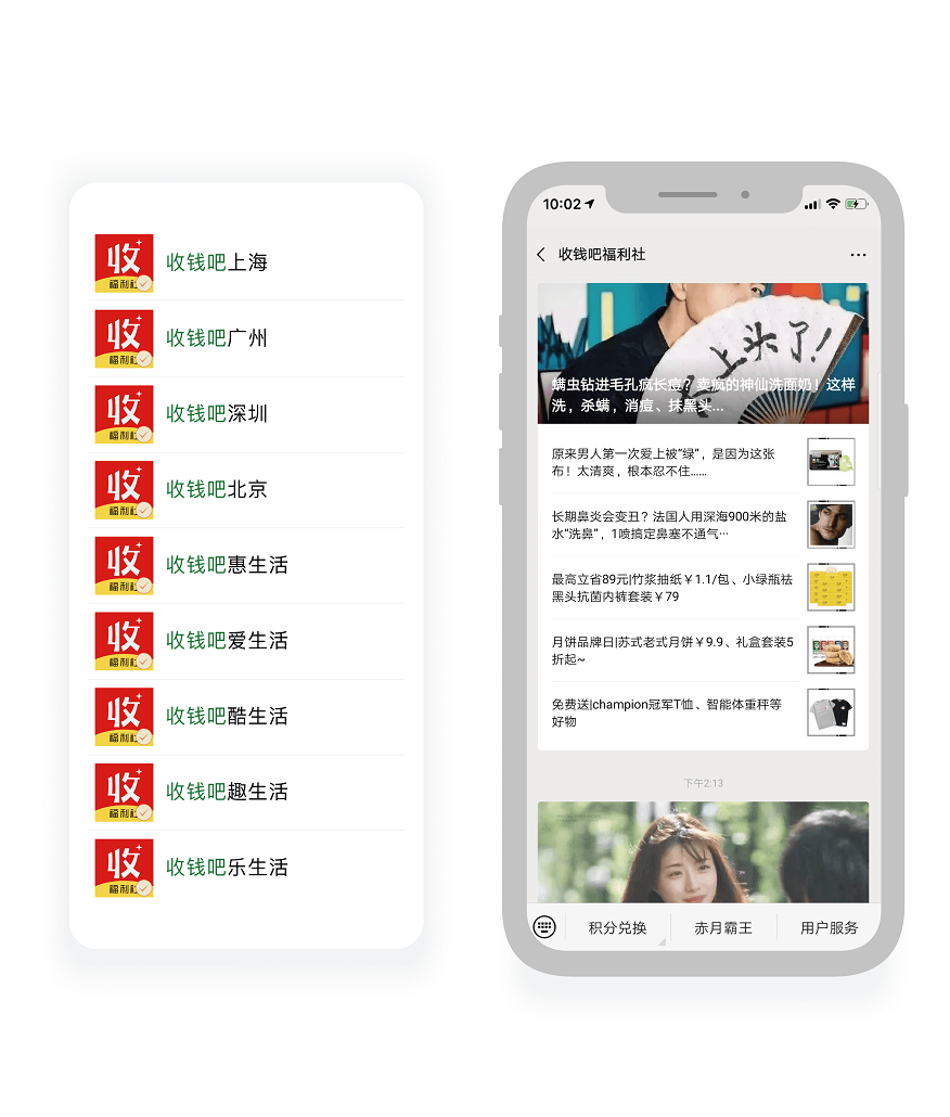 福利好货平台拥有全国级的“收钱吧福利社”、区域级(收钱吧上海等)和生活类(收钱吧惠生活等)在内的多个公众号矩阵群。