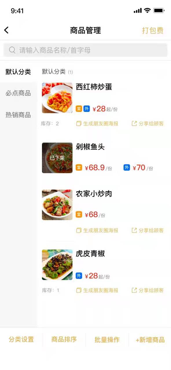 1、收钱吧扫码点餐到店商品与自营外卖商品合并成一个入口商品管理